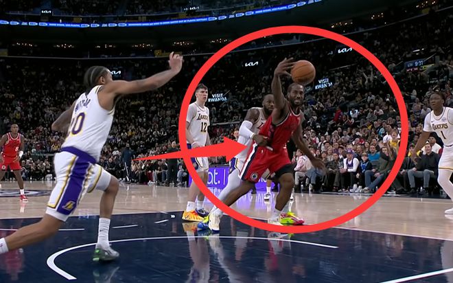 當時這個回合是第4節(jié)還有9分26秒的時候,萊昂納德單打詹姆斯,一個回合里遭遇到了詹皇四次犯規(guī),一拉一切一摟一推,裁判一個都沒吹。咱們看一下當時的這個慢動作回放,這個回合是這樣的,萊昂納德碾著湖人球員殺入籃下上籃不中,自己搶到籃板要二次進攻,詹姆斯趕緊沖上來防守。